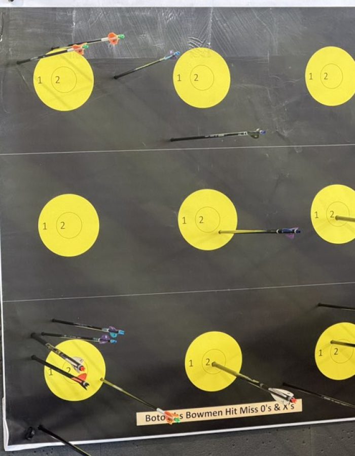 Our own Easter fun shoot with a mix of teams of compound, recurve and bare bow archers. Noughts and Crosses with a custom Hit or Miss target followed by a game of 501 on the Darts target.